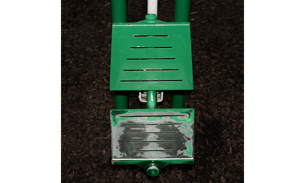 formes, de leurs couleurs. Si l'absence d'usager·ère·s est notable, les changements qui apparaissent à la surface de ces équipements révèlent, comme en négatif, leur usage : par le passage répété des mains, ou d'autres parties du corps, de la matière est déposée ou emportée. Ce jeu de translation entre les corps qui s'exercent et ces équipements sportifs semble donner à ces derniers des attributs